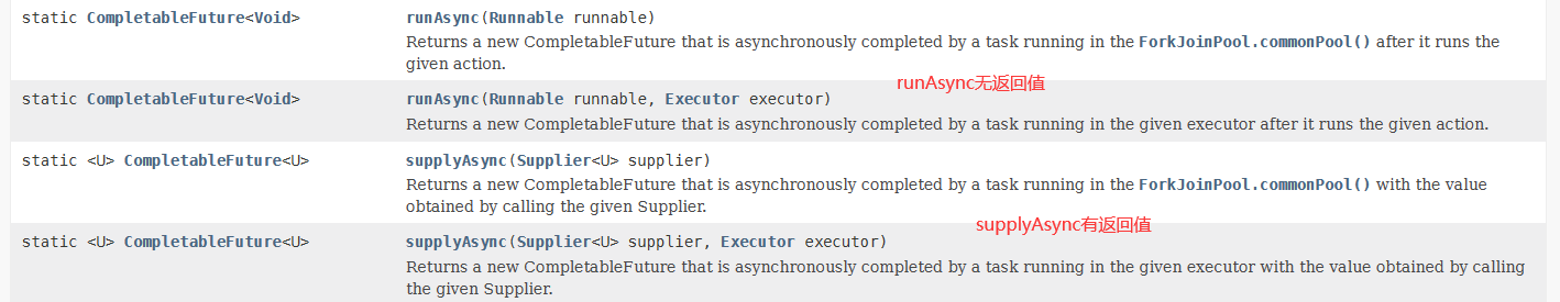 static CompletableFuture<Void> runAsync(Runnable runnable):异步执行指定的Runnable任务。static CompletableFuture<Void> runAsync(Runnable runnable, Executor executor):在指定的Executor上异步执行Runnable任务。static <U> CompletableFuture<U> supplyAsync(Supplier<U> supplier):异步执行指定的Supplier任务,并返回CompletableFuture对象,该对象在计算完成时将提供结果。static <U> CompletableFuture<U> supplyAsync(Supplier<U> supplier, Executor executor):在指定的Executor上异步执行Supplier任务,并返回一个CompletableFuture对象,该对象在计算完成时将提供结果。