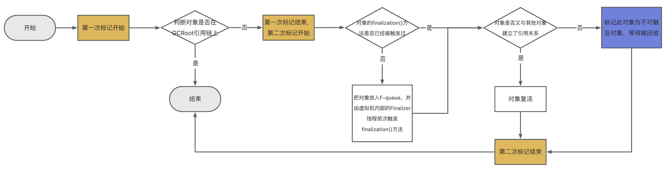 - finalization()方法已经被调用过。如果此对象没有重写finalization()方法且finalization()方法已经被虚拟机调用过了,或者此对象重写了finalization()方法,也已经被虚拟机调用过了,则直接标记这个对象为不可触及对象