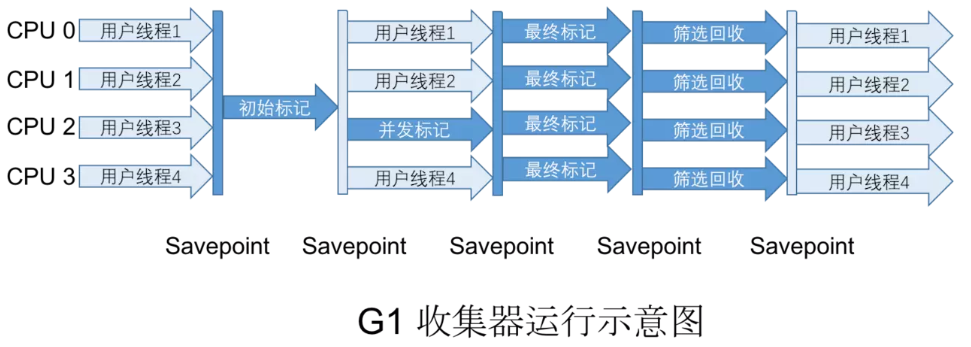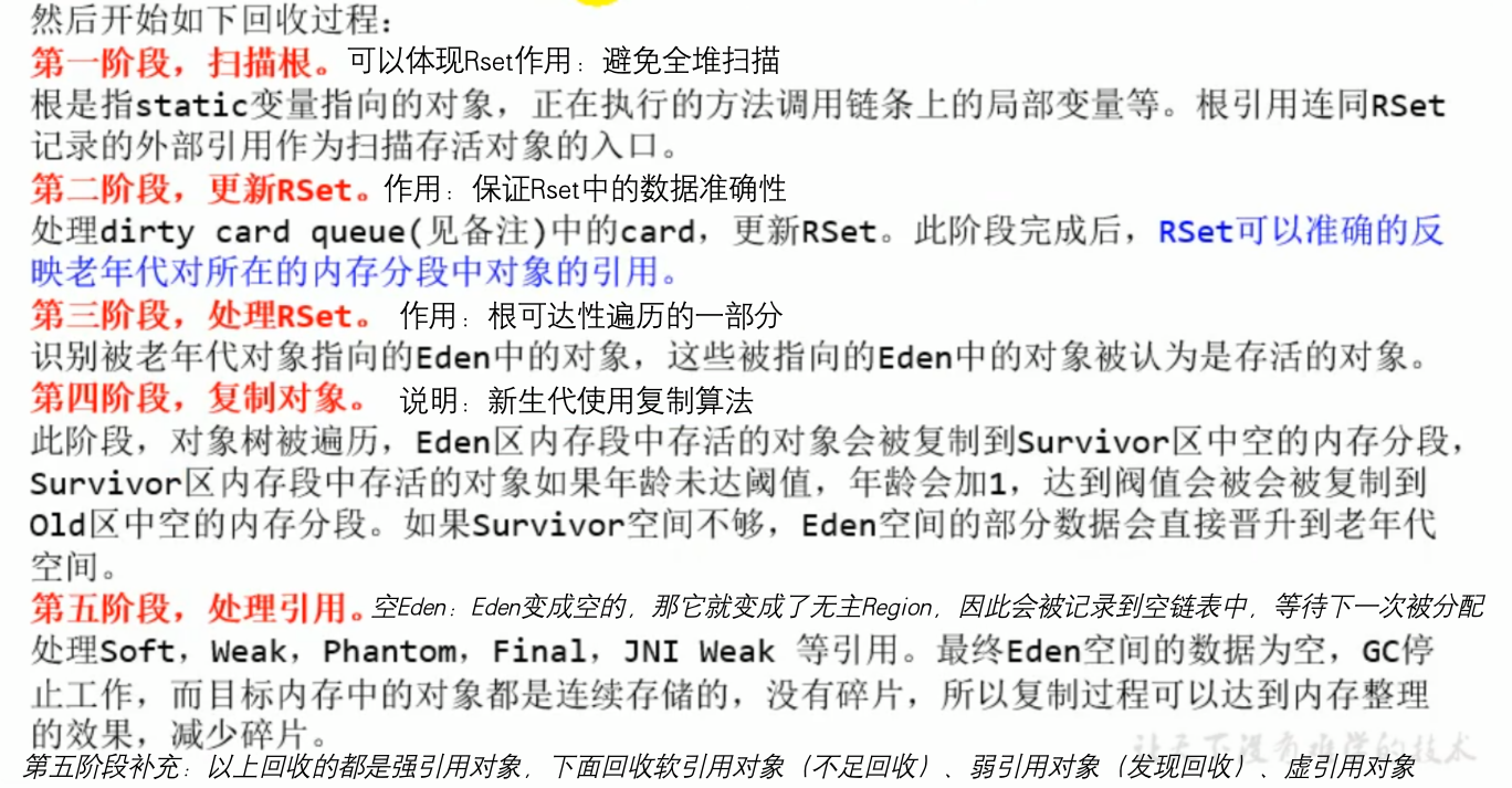 - 如果没有被回收的区域内的对象引用了要回收的区域的对象,该如何解决?是否需要全堆扫描?全堆扫描的效率低下。使用记忆集进行解决,JVM会为每一个Region分配一个记忆集,记忆集中记录了本区域内哪些对象(包括引用类型对象)被其他区域所引用。在实际回收过程中,GCRoots引用链引用到的本区域内的对象加上记忆集中的对象构成整个存活对象集。