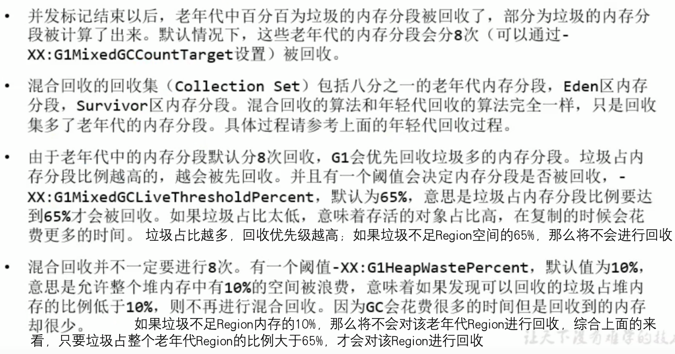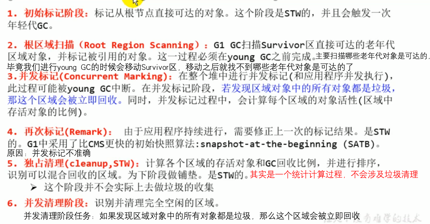 - 【重点】G1的每个Region都维护有自己的记忆集,这些记忆集会记录下别的Region 指向自己的指针,并标记这些指针分别在哪些卡页(卡表的单个元素)的范围之内。G1的记忆集在存储结构的本质上是一 种哈希表,Key是别的Region的起始地址,Value是一个集合,里面存储的元素是卡表的索引号。这种“双向”的卡表结构(卡表是“我指向谁”,这种结构还记录了“谁指向我”),由于记忆集的存在,会造成JVM堆容量10%到20%的空间浪费。