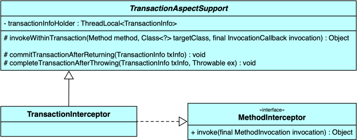 - 在执行目标方法时进行事务增强操作:当通过代理对象调用Bean方法的时候,会触发对应的AOP增强拦截器,声明式事务是一种环绕增强,对应接口为MethodInterceptor,事务增强对该接口的实现为TransactionInterceptor,类图如下: