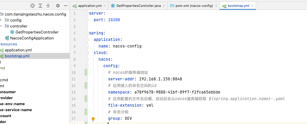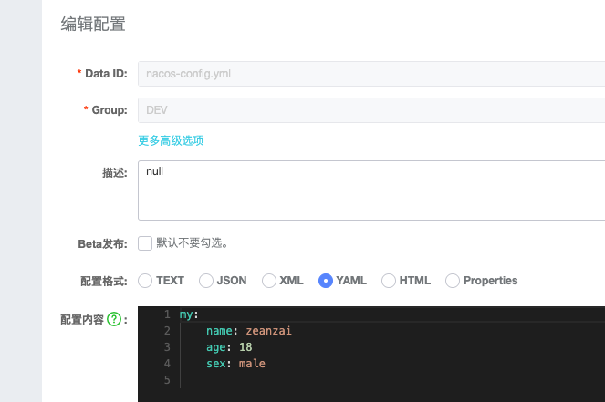 ${prefix}-${spring.profiles.active}.${file-extension}, 其中 prefix 为前缀,默认是 spring.application.name 的值,当然也可以通过 spring.cloud.nacos.config.prefix 来进行配置;spring.profiles.active 为项目生效的 profile 的名称,这个值和前面的短横杠为空时,DataID 变成${prefix}-${spring.profiles.active}.${file-extension},这种方式也是合法的;file-exetension 表示配置文件的格式,目前只支持properties和yaml类型; - 命名空间