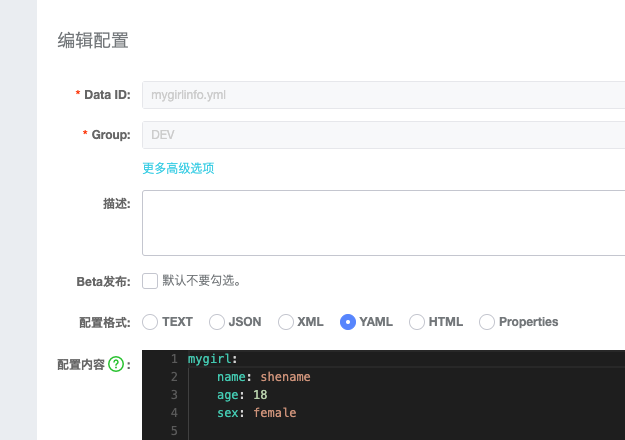 - Data ID :配置项的唯一标识,可以理解为一个配置文件,它的命名格式是: