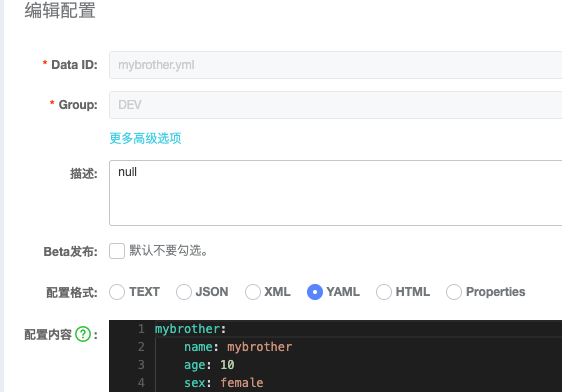 @ConfigurationProperties(prefix = "mybrother")// prefix 的值就是控制台添加的配置文件的名称
